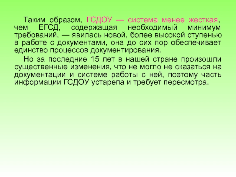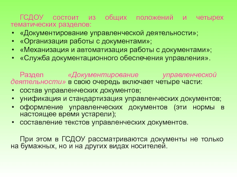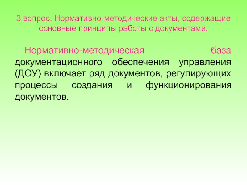 ДОУ регулируется действующим законодательством, распорядительными документами, вышестоящими документами, положениями о предприятии, основными положениями ГСДОУ и правилами архивного управления.