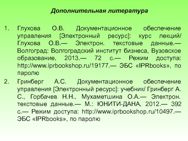 Гринберг А.С. Документационное обеспечение управления [Электронный ресурс]: учебник/ Гринберг А.С., Горбачев Н.Н., Мухаметшина О.А.— Электрон. текстовые данные.— М.: ЮНИТИ-ДАНА, 2012.— 392 c.— Режим доступа: http://www.iprbookshop.ru/10497.— ЭБС «IPRbooks», по паролю
