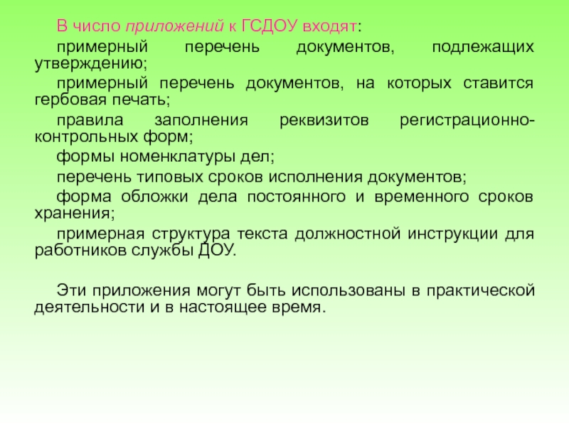 В Инструкции получили развитие основные положения ГСДОУ. Этот документ в большей степени отражает современное состояние дел в сфере ДОУ.