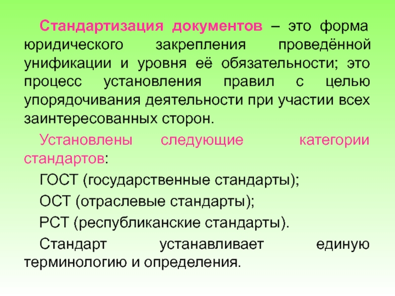 Слайд 31Стандартизация документов – это форма юридического закрепления проведённой унификации и