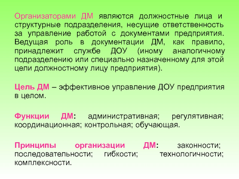 организаторы ДМ должностные лица, инициирующие процесс управления документацией, а также персоналом, несущим ответственность за работу с документами предприятия;