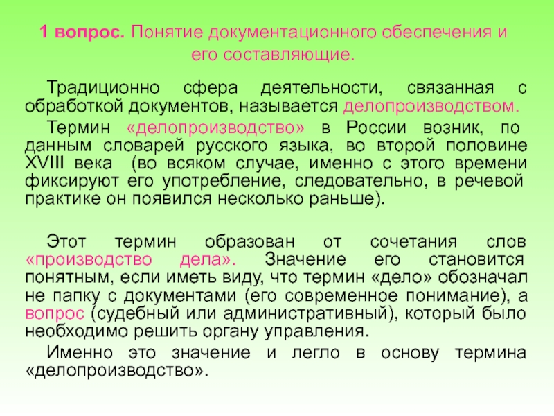 Слайд 5В наше время термин «делопроизводство» определяется следующим образом: отрасль деятельности,