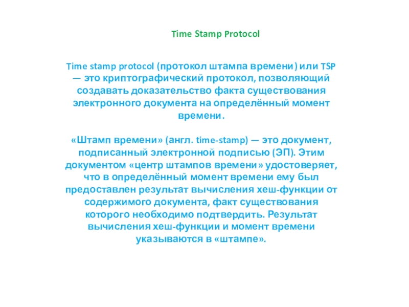 «Штамп времени» (англ. time-stamp) — это документ, подписанный электронной подписью (ЭП). Этим документом «центр штампов времени» удостоверяет, что в определённый момент времени ему был предоставлен результат вычисления хеш-функции от содержимого документа, факт существования которого необходимо подтвердить. Результат вычисления хеш-функции и момент времени указываются в «штампе».