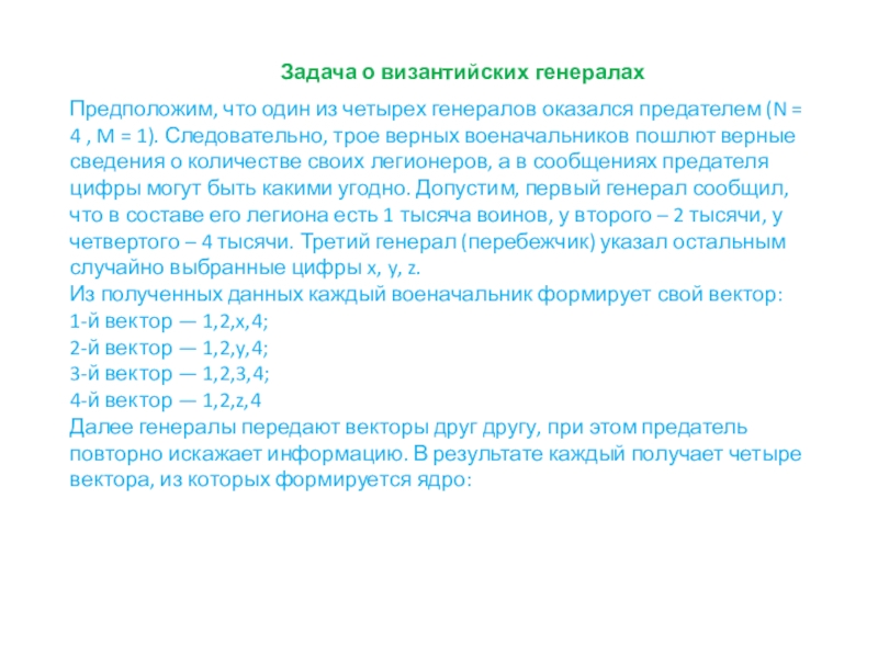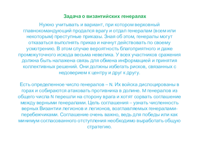 Есть определенное число генералов – N. Их войска дислоцированы в горах и собираются атаковать противника в долине. M генералов из общего числа N перешли на сторону врага и хотят сорвать соглашение между верными генералами. Цель соглашения – узнать численность верных Византии легионов и легионов, возглавляемых генералами-перебежчиками. Соглашение очень важно, ведь для победы или как минимум согласованного отступления необходимо выработать общую стратегию.