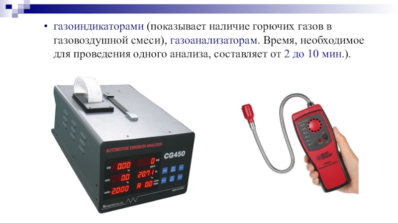 Слайд 32газоиндикаторами (показывает наличие горючих газов в газовоздушной смеси), газоанализаторам. Время,