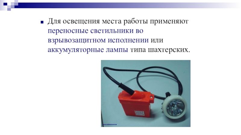 Слайд 53Для освещения места работы применяют переносные светильники во взрывозащитном исполнении