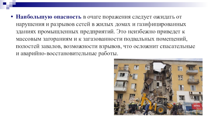 Это неизбежно приведет к массовым загораниям и к загазованности подвальных помещений, полостей завалов, возможности взрывов, что осложнит спасательные и аварийно-восстановительные работы.