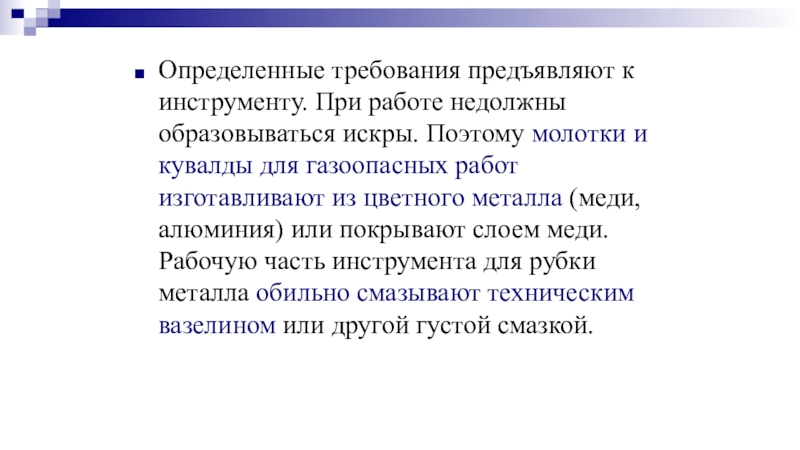 Слайд 51Определенные требования предъявляют к инструменту. При работе недолжны образовываться искры.