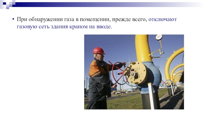 Слайд 34При обнаружении газа в помещении, прежде всего, отключают газовую сеть