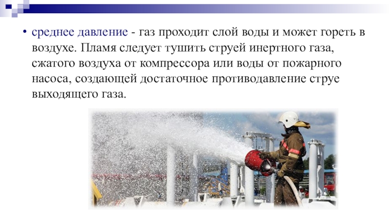 Слайд 37среднее давление - газ проходит слой воды и может гореть