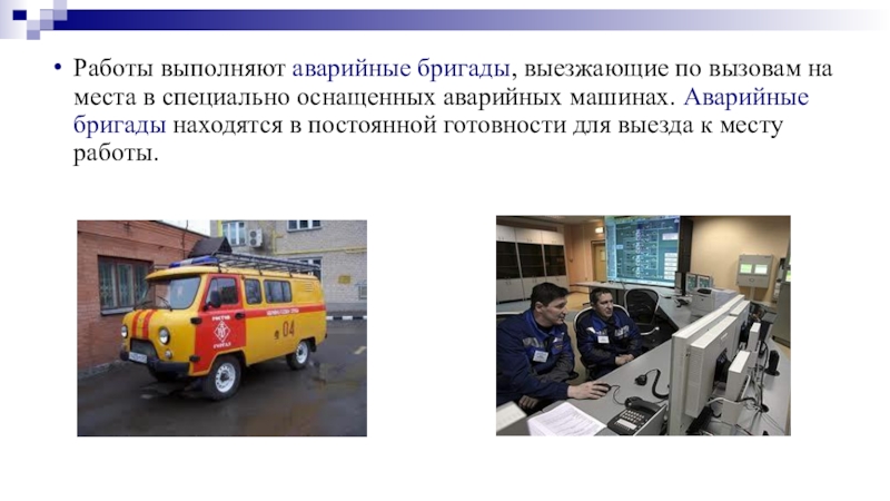 Слайд 43Работы выполняют аварийные бригады, выезжающие по вызовам на места в