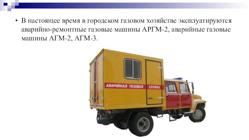 Слайд 46В настоящее время в городском газовом хозяйстве эксплуатируются аварийно-ремонтные газовые