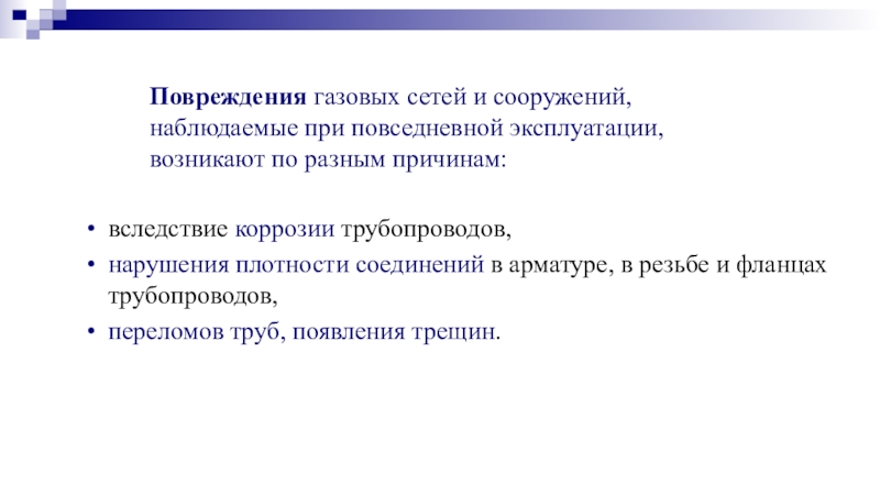 Слайд 6Повреждения газовых сетей и сооружений, наблюдаемые при повседневной эксплуатации, возникают