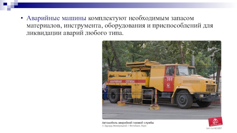 Слайд 47Аварийные машины комплектуют необходимым запасом материалов, инструмента, оборудования и приспособлений