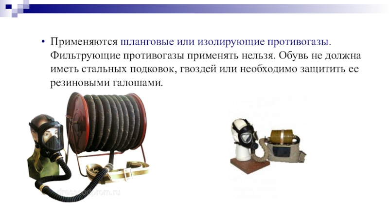 Слайд 50Применяются шланговые или изолирующие противогазы. Фильтрующие противогазы применять нельзя. Обувь