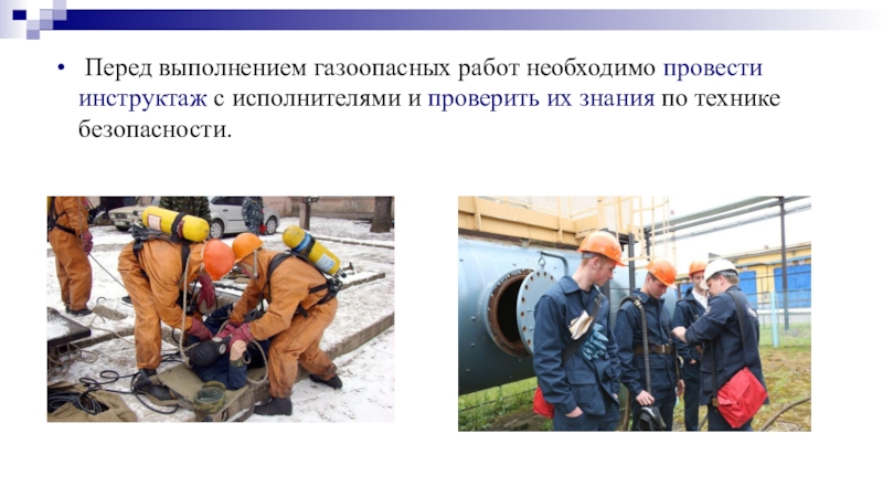 Слайд 58 Перед выполнением газоопасных работ необходимо провести инструктаж с исполнителями