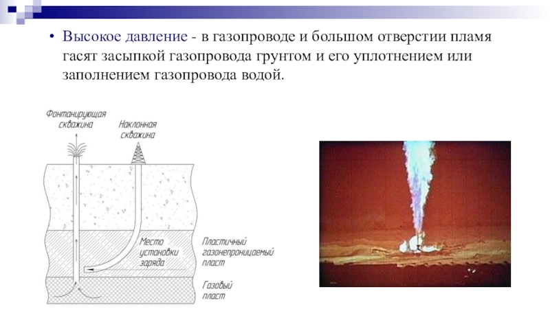 Слайд 38Высокое давление - в газопроводе и большом отверстии пламя гасят
