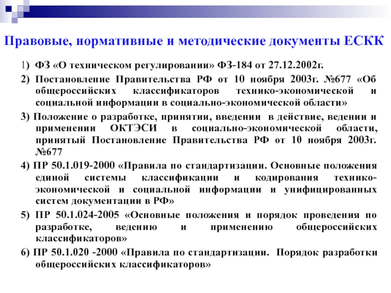 3) Положение о разработке, принятии, введении в действие, ведении и применении ОКТЭСИ в социально-экономической области, принятый Постановление Правительства РФ от 10 ноября 2003г. №677