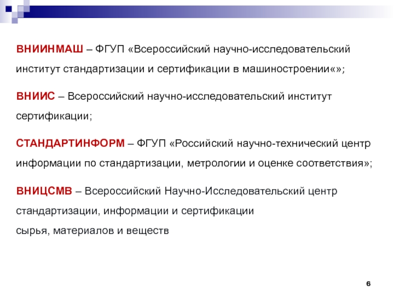 Слайд 6ВНИИНМАШ – ФГУП «Всероссийский научно-исследовательский институт стандартизации и сертификации в