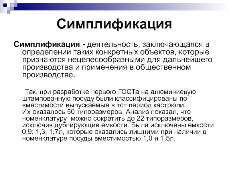 Симплификация - деятельность, заключающаяся в определении таких конкретных объектов, которые