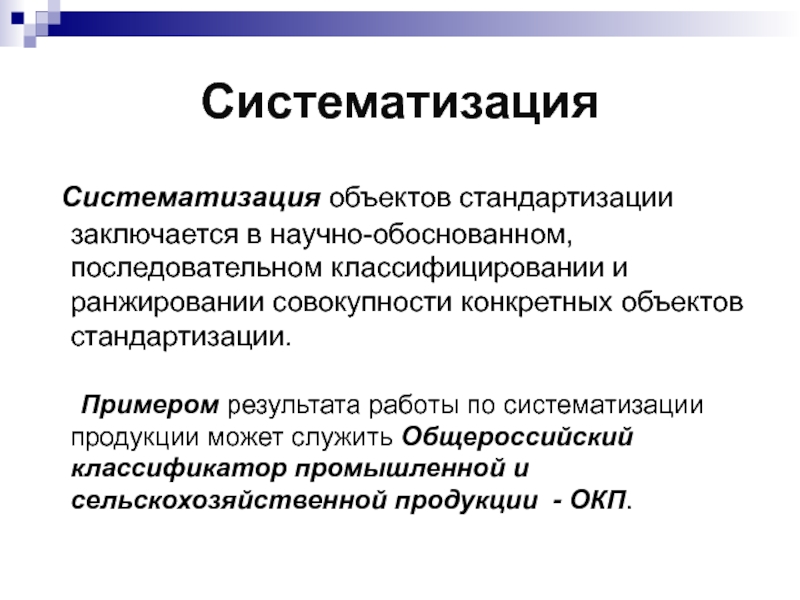 Систематизация объектов стандартизации заключается в научно-обоснованном, последовательном классифицировании и