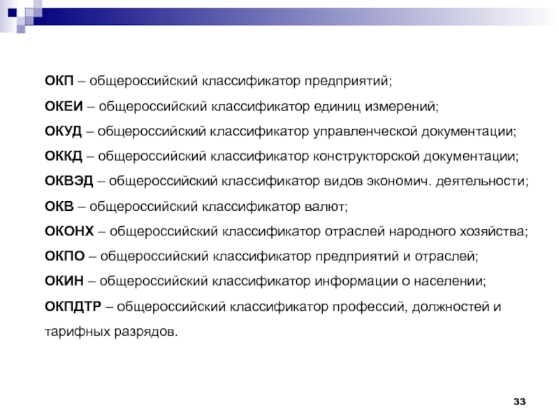 Слайд 33ОКП – общероссийский классификатор предприятий;