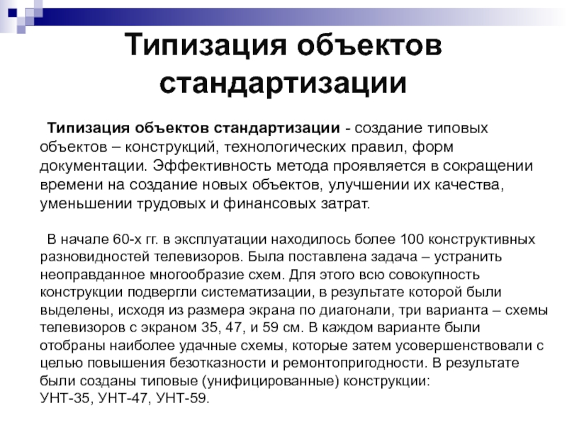 В начале 60-х гг. в эксплуатации находилось более 100 конструктивных разновидностей телевизоров. Была поставлена задача – устранить неоправданное многообразие схем. Для этого всю совокупность конструкции подвергли систематизации, в результате которой были выделены, исходя из размера экрана по диагонали, три варианта – схемы телевизоров с экраном 35, 47, и 59 см. В каждом варианте были отобраны наиболее удачные схемы, которые затем усовершенствовали с целью повышения безотказности и ремонтопригодности. В результате были созданы типовые (унифицированные) конструкции: