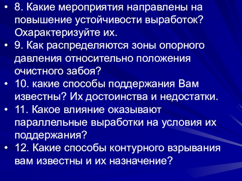 Слайд 278. Какие мероприятия направлены на повышение устойчивости выработок? Охарактеризуйте их.