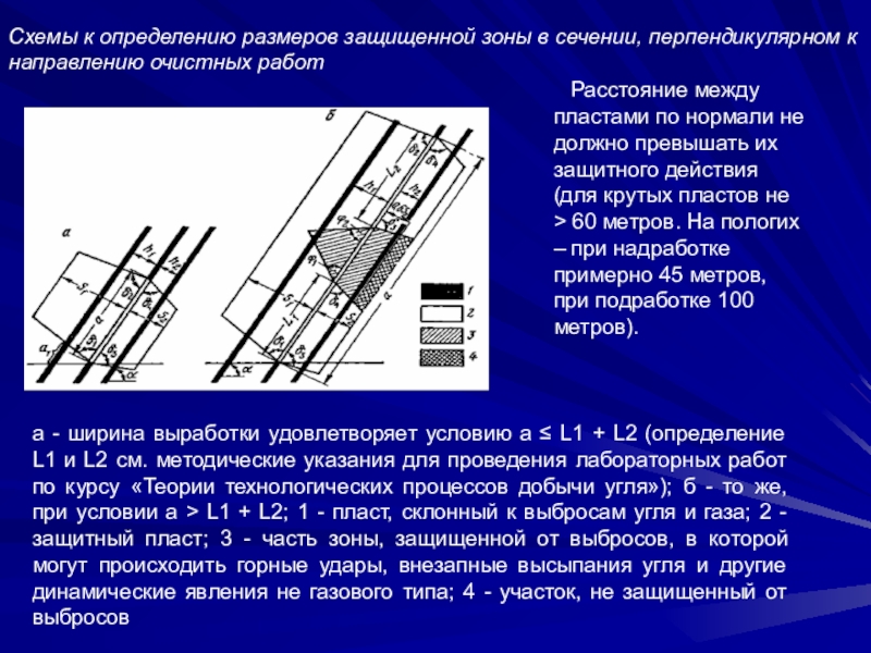 Расстояние между пластами по нормали не должно превышать их защитного действия (для крутых пластов не > 60 метров. На пологих – при надработке примерно 45 метров, при подработке 100 метров).
