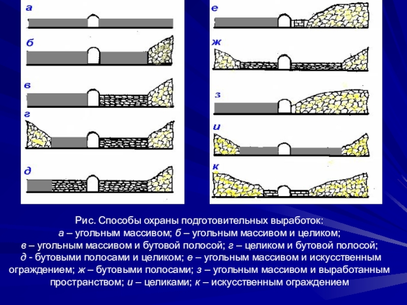 д - бутовыми полосами и целиком; е – угольным массивом и искусственным ограждением; ж – бутовыми полосами; з – угольным массивом и выработанным пространством; и – целиками; к – искусственным ограждением