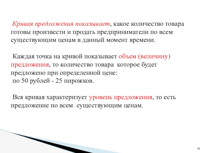 Каждая точка на кривой показывает объем (величину) предложения, то количество товара которое будет предложено при определенной цене: