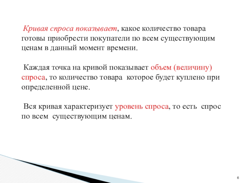 Вся кривая характеризует уровень спроса, то есть спрос по всем существующим ценам.