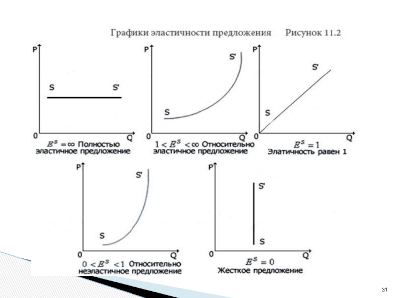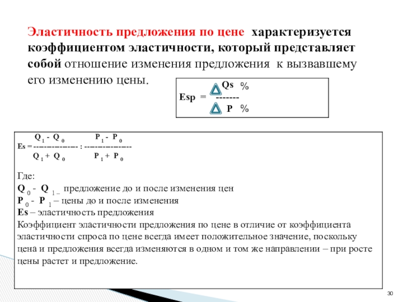 Слайд 30Эластичность предложения по цене характеризуется коэффициентом эластичности, который представляет собой