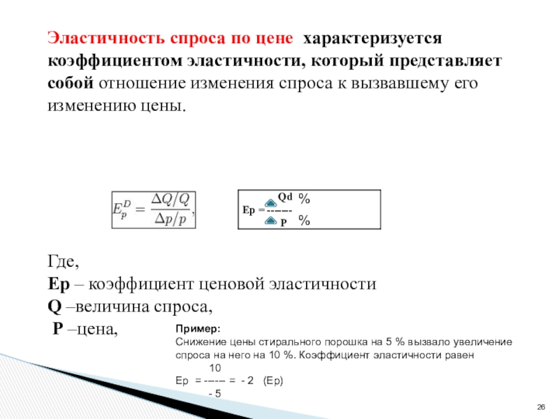 Слайд 26Эластичность спроса по цене характеризуется коэффициентом эластичности, который представляет собой