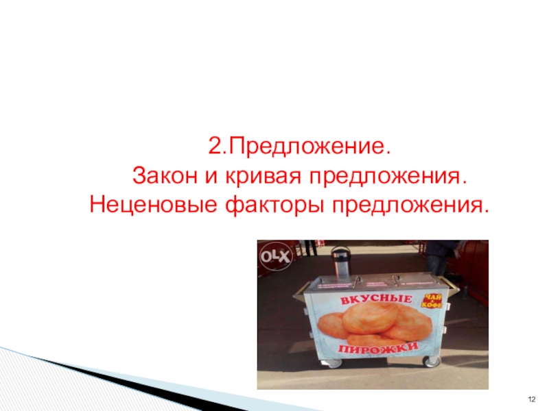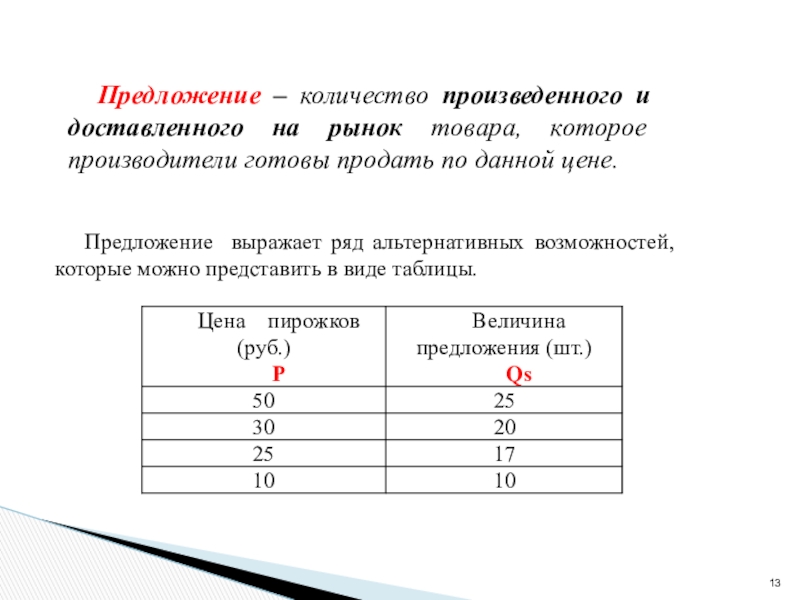 Слайд 13Предложение – количество произведенного и доставленного на рынок товара, которое