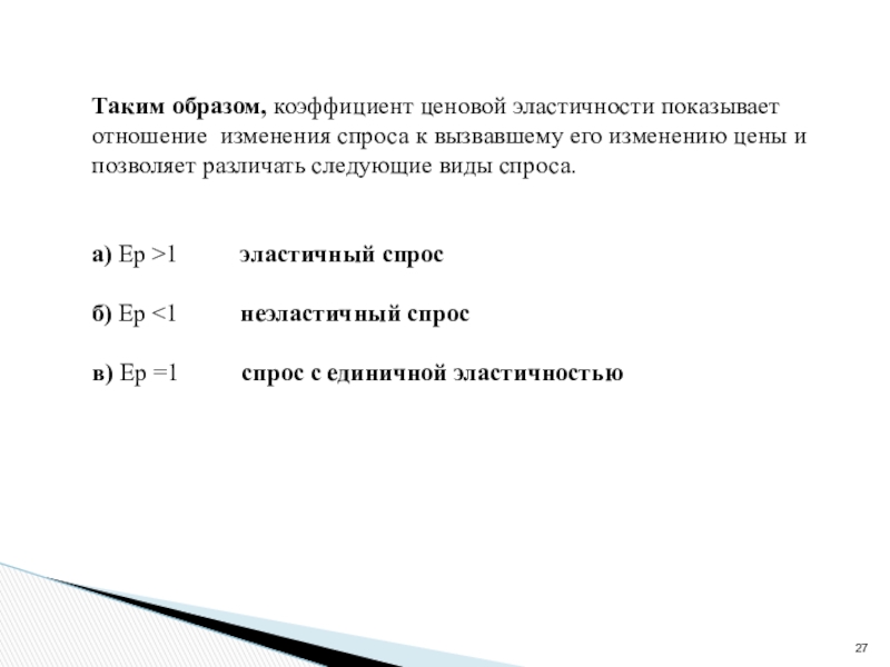 Слайд 27Таким образом, коэффициент ценовой эластичности показывает отношение изменения спроса к