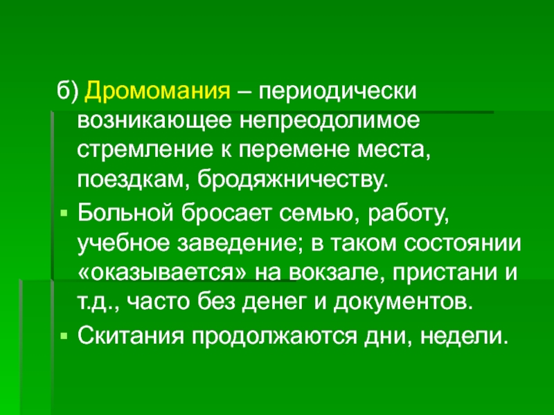 в) В третьих случаях проявляется импульсивным бегством, бродяжничеством, пароксизмами бессмысленного разрушения предметов.