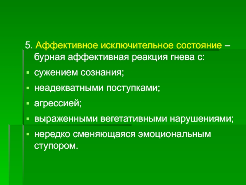 Слайд 125. Аффективное исключительное состояние – бурная аффективная реакция гнева с: