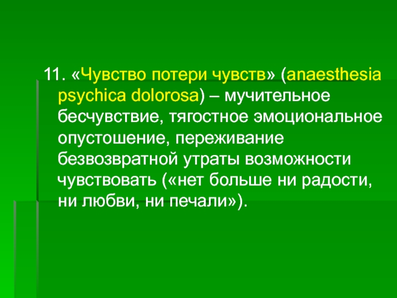 Слайд 2011. «Чувство потери чувств» (anaesthesia psychica dolorosa) – мучительное бесчувствие,