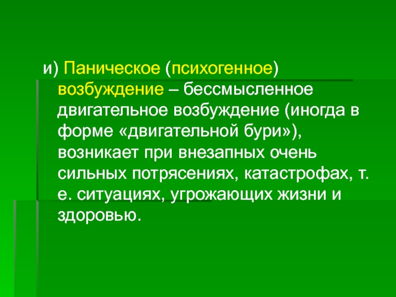 Слайд 52и) Паническое (психогенное) возбуждение – бессмысленное двигательное возбуждение (иногда в