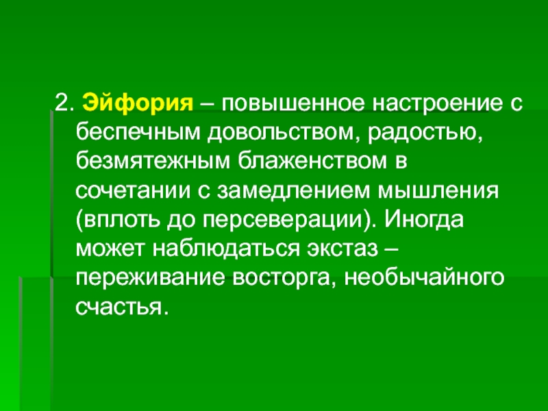 Слайд 52. Эйфория – повышенное настроение с беспечным довольством, радостью, безмятежным