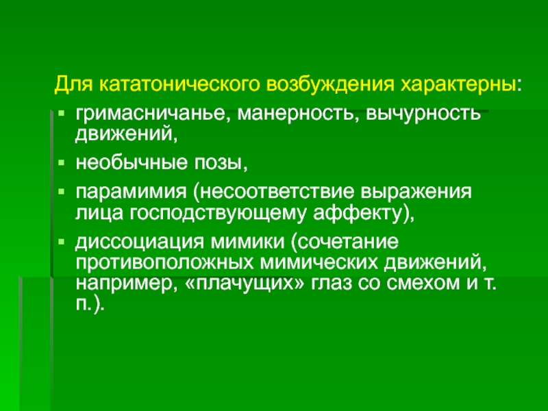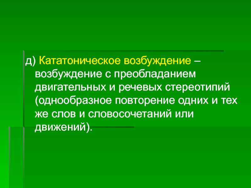 Слайд 46д) Кататоническое возбуждение – возбуждение с преобладанием двигательных и речевых