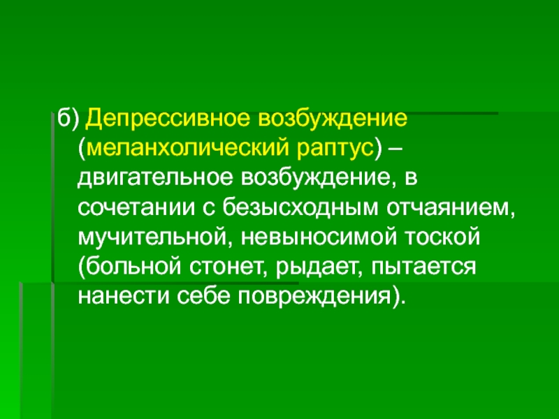 Слайд 43б) Депрессивное возбуждение (меланхолический раптус) – двигательное возбуждение, в сочетании