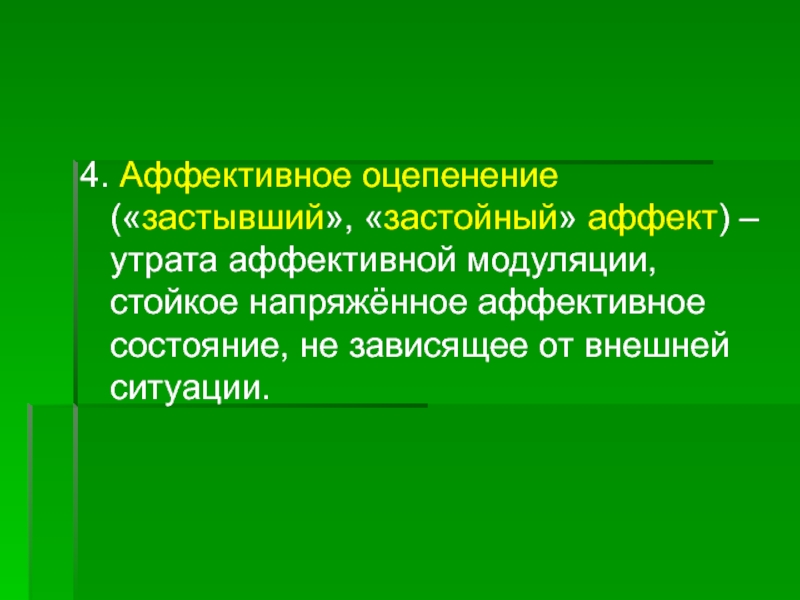 Слайд 114. Аффективное оцепенение («застывший», «застойный» аффект) – утрата аффективной модуляции,