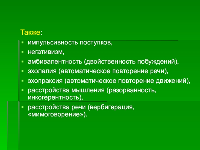 4. Парабулия (извращение волевой активности) – сопровождается соответствующей деятельностью: негативизмом, импульсивностью, вычурностью движений.