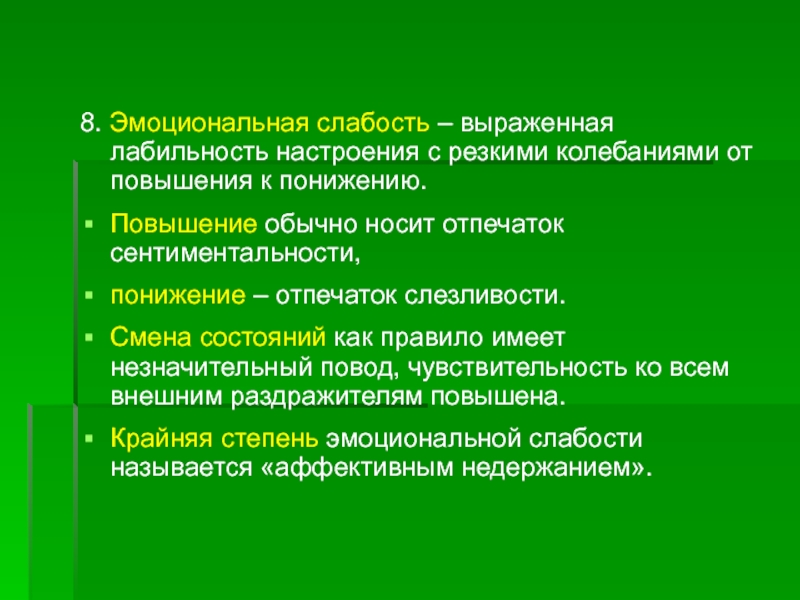 Слайд 178. Эмоциональная слабость – выраженная лабильность настроения с резкими колебаниями