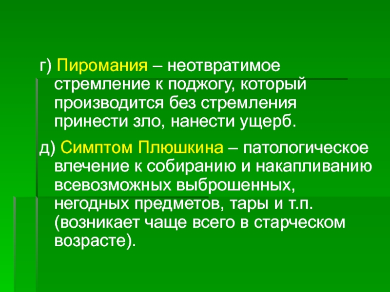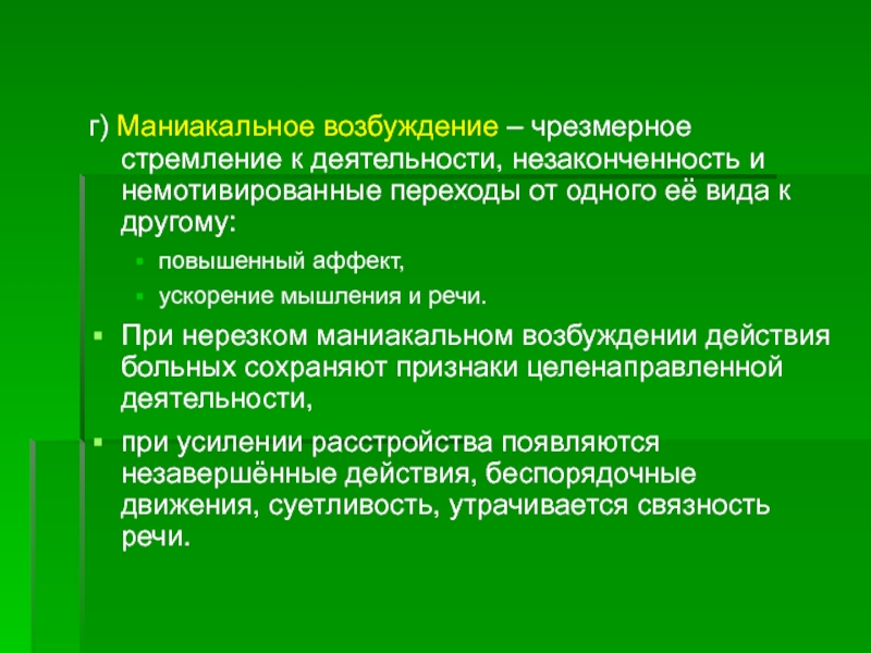 Слайд 45г) Маниакальное возбуждение – чрезмерное стремление к деятельности, незаконченность и