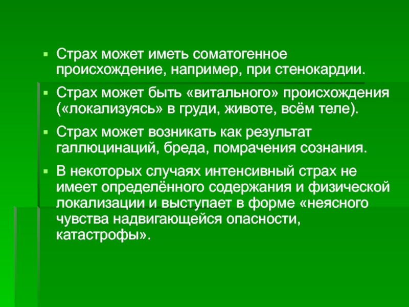 Слайд 16Страх может иметь соматогенное происхождение, например, при стенокардии.