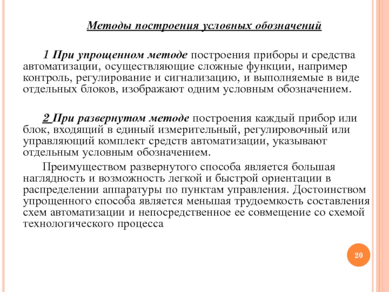 Преимуществом развернутого способа является большая наглядность и возможность легкой и быстрой ориентации в распределении аппаратуры по пунктам управления. Достоинством упрощенного способа является меньшая трудоемкость составления схем автоматизации и непосредственное ее совмещение со схемой технологического процесса