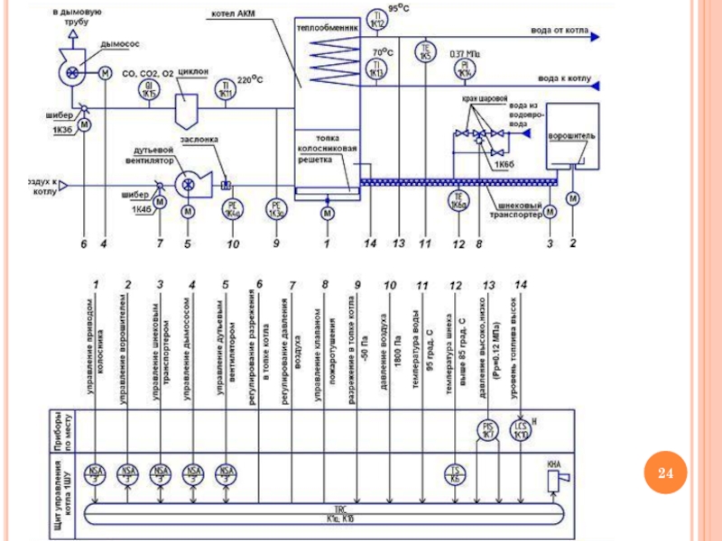 управления и средства автоматизации (приборы, регуляторы, вычислительные устройства) с указанием связей между технологическим оборудованием и элементами автоматики, а также связей между отдельными элементами автоматики.